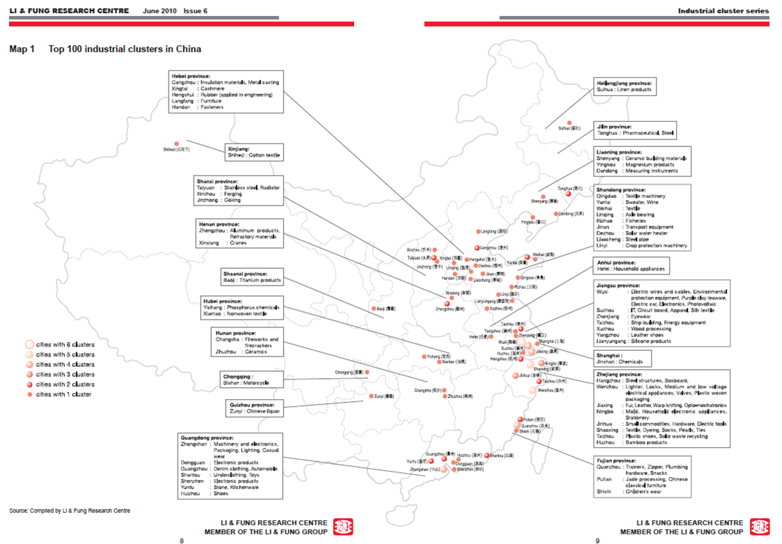 Le paysage manufacturier de la Chine est caractérisé par un grand nombre de grappes industrielles, c’est à dire des concentrations géographiques d’entreprises d’une même industrie, lesquelles sont interconnectées entre elles. L’existence de ces grappes industrielles augmente la compétitivité des économies régionales où elles sont localisée. Le Centre de recherche Li & Fung s’intéresse au sujet et publie la liste des 100 grappes industrielles principales identifiées à la fin de 2009 par la Chinese Academy of Social Sciences (CASS). La ville des bas (Sock City) est l’une de ces grappes.