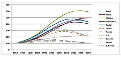 Ça y est, les acronymes BRIC, BRICS et BASIC se sont débarrassés du C (pour Chine). Il faudra maintenant se tourner vers le TIMBI (Turquie, Inde, Mexique, Brésil et Indonésie). Certains médias apprécient ces acronymes, posés comme signifiants dans le processus décisionnels de nos entreprises quant aux marchés à investir. Le TIMBI est l’œuvre de l’Américain Jack A. Goldstone de la George Mason University. Quel est l’intérêt du TIMBI ? La jeunesse de la population et la forte croissance économique des pays qui composent le regroupement. Les données sont en effet là pour confirmer la croissance prévue d’ici 2050 du bassin de main-d’œuvre de 15 à 59 ans … si, bien sûr, tout se passe comme prévu – pas de tremblement de terre ou de tsunami dévastateurs, pas d’insurrection politique et pas de politique anti-nataliste de type maoïste.