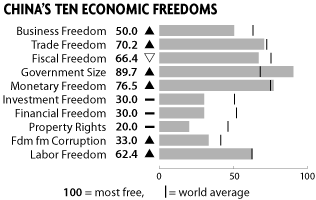 - La Heritage Foundation publie chaque année un « Index de la liberté économique ». Dans sa version 2008, et comme par les années passées, Hong Kong et Singapour se classent bonnes premières, devant le Canada en 7e place. La Chine occupe le 126e rang, parmi les pays où la liberté de commerce est très restreinte. Les notes obtenues pour chacune des sphères de libertés sont données ci-dessous. Pour plus d’information sur la méthodologie et les explications derrière les évaluations obtenues, voir la page consacrée à la Chine . À noter, un outil d’analyse permet de réaliser des comparaisons entre les pays sur chacune des libertés et les données sont disponibles en format Excel