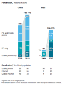 - Dans un rapport intitulé « Riding Asia’s digital tiger » McKinsey affirme que la Chine aurait aujourd’hui 429 millions d’utilisateurs d’Internet, c’est à dire plus de 30 % de sa population. L’entreprise prévoit que ce nombre doublera d’ici cinq ans, pour atteindre 770 millions de personnes, ou 55 % de la population chinoise (McKinsey Quarterly, septembre 2010)
